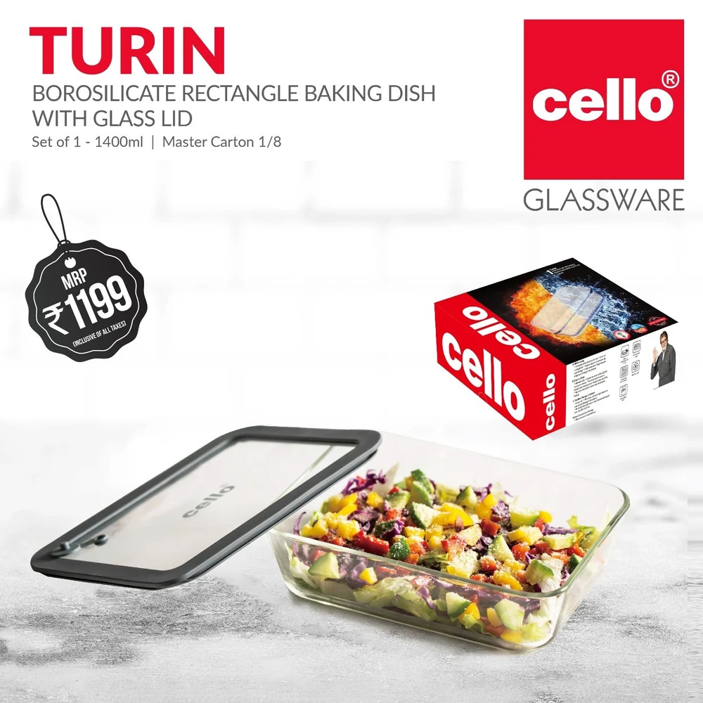 Cello Turin Bakedish rectangle with lid (Borosilicate) | 1400ml