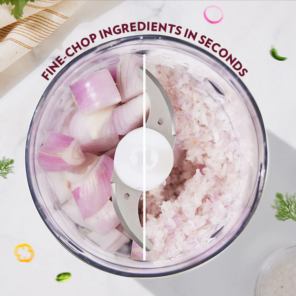- Dual blades enable chopping of spinach and other leafy vegetables