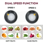 - Durable 3 speed control with pulse function for greater control for precise juicing – use low speed for soft fruit juicing and high speed for harder fruits and vegetables.