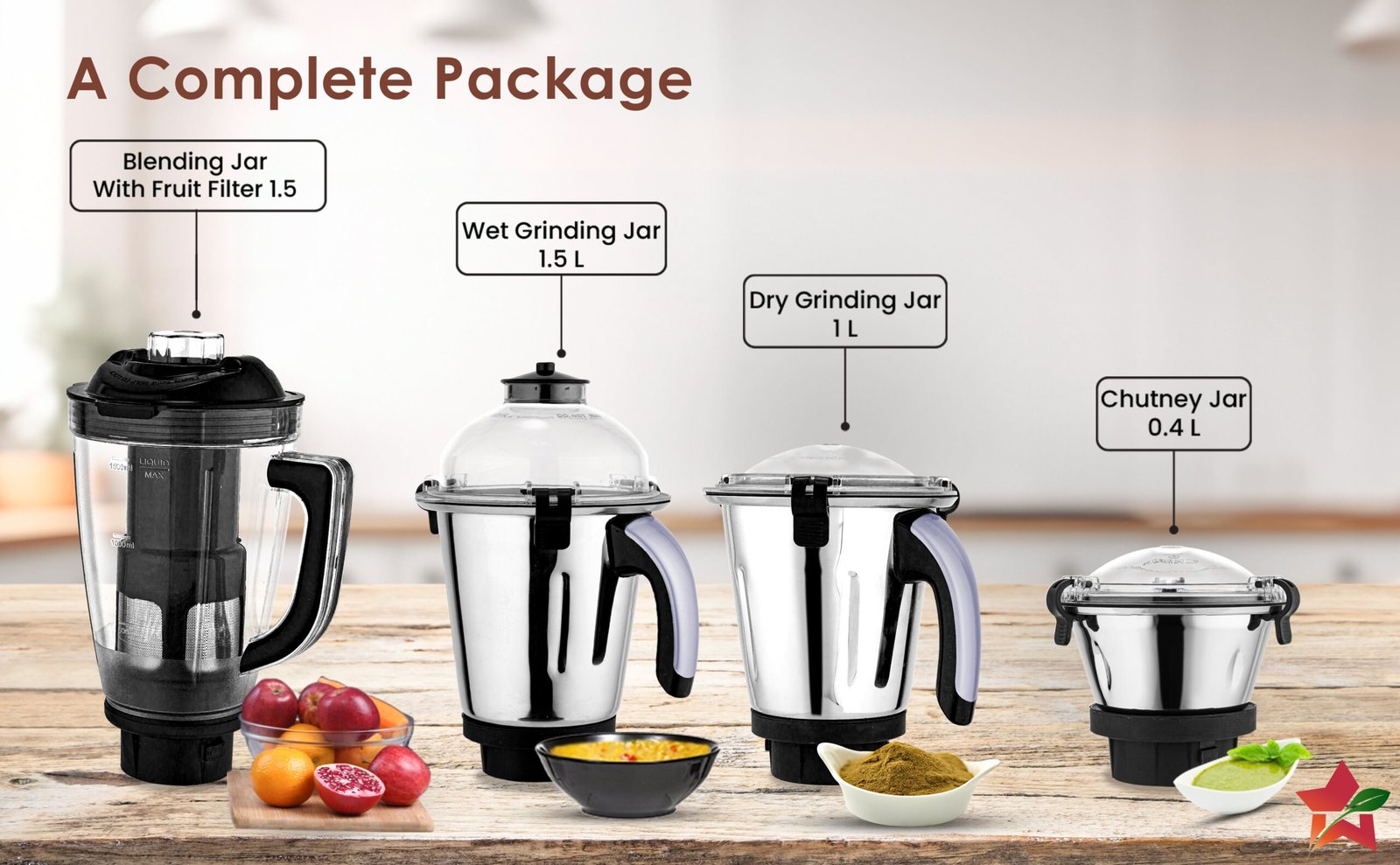 - One Machine, Many Possibilities: The Galaxy Mixer Grinder has four jars of varying capacities and super sharp stainless steel blades, perfect for dry grinding, wet grinding, chutney making, juicing, and blending.