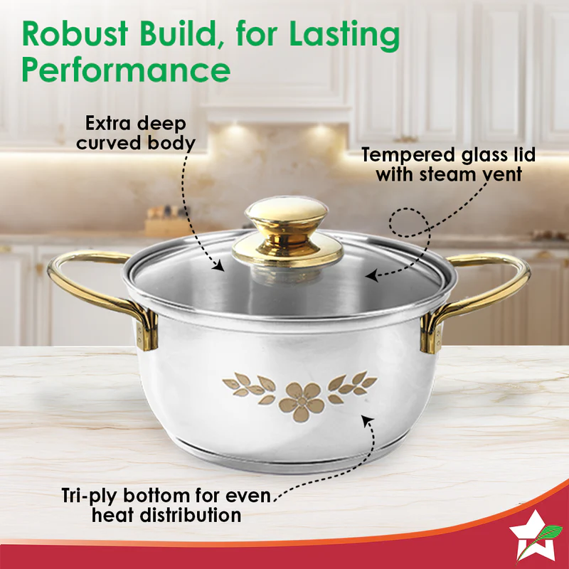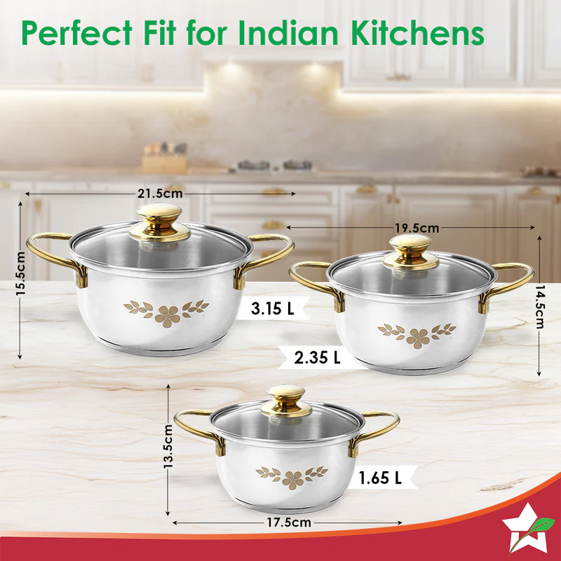 Gold Stanton Stainless Steel 3-piece Casserole Set with Glass Lid | Golden knobs and handles | Induction & Gas Stove friendly | Set of 3 (1.6L, 2.3L, 3.1L)