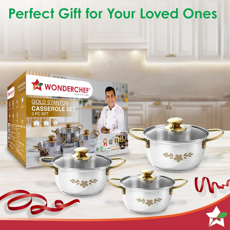 - VERSATILE AND DURABLE: The Wonderchef Gold Stanton Casserole Set is suitable for gas stoves, Induction Cooktoops, hot plates, and ceramic plates, making it versatile for all your cooking needs. Built to last, these casseroles are designed for everyday use.