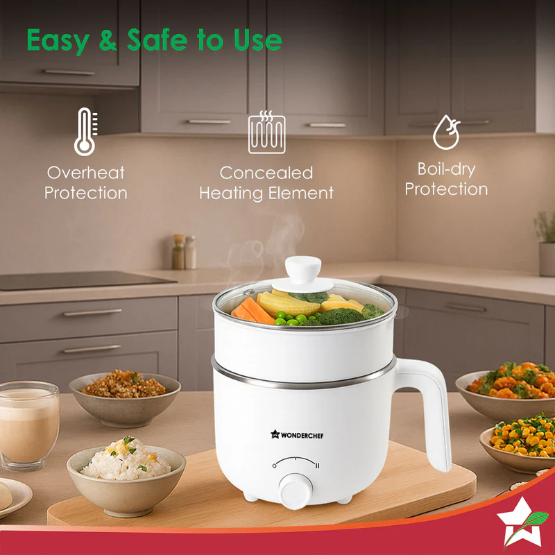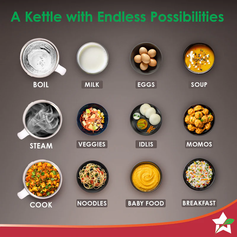 - Versatile Cooking: Boil water and milk for tea, coffee, hot chocolate, cook instant noodles and pasta, boil soups, steam rice, momos, dhokla, boil eggs and do much more!