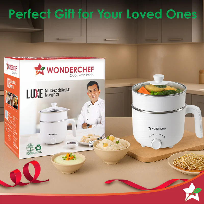 Wonderchef Luxe Multi-cook Kettle – now in a stunning and elegant Ivory shade. With a strong stainless steel interior, an egg stand and a steamer basket, this kettle is fully equipped to help you with multiple tasks on busy mornings! Comes in a compact size, thus making it convenient to store. Get this product today to make your breakfast time healthy and happy! The perfect multi-utility companion for everyday cooking!