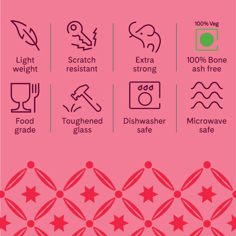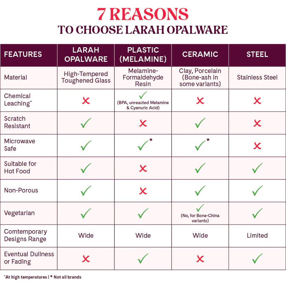 Larah by Borosil presents Opalware sets with elegant designs. Opalglass is 100 percent bone ash free, thus fit for vegetarians. It is also light weight and chip resistance making is suitable for daily use.