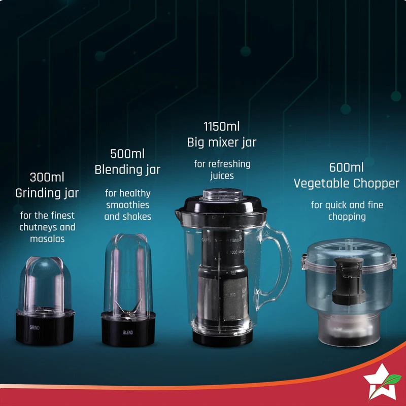 - A Complete Solution: Make nutritious smoothies and dips with the 4-wing blade in the tall jar (500ml), grind flavourful chutneys and masalas with the 2-wing blade in the short jar (300ml), blend fresh fruit and vegetable juices in the big jar with juicer attachment (1150ml), and chop fine vegetables with the chopper attachment.