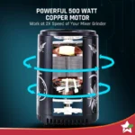 - Powerful 500-Watt 100% Copper Motor: The best-in-class and powerful 500-Watt motor generates 22,000 RPM – twice that of normal mixer grinders. 100% Copper motor grinds the toughest chutneys and masalas with ease.