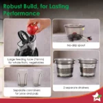 - Powerful and Nutritional: The vertical cold press juicer features a high-torque, low-speed 240W motor that quietly spins at 55 RPM to produce minimal heat buildup and oxidation for juice that extracts maximum immunity-boosting and health-enhancing nutrients, vitamins, and enzymes.