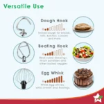 - FOUR DIFFERENT ATTACHMENTS: Whisking cone, mixing beater, a splash cover and dough hook, catering to all baking needs.